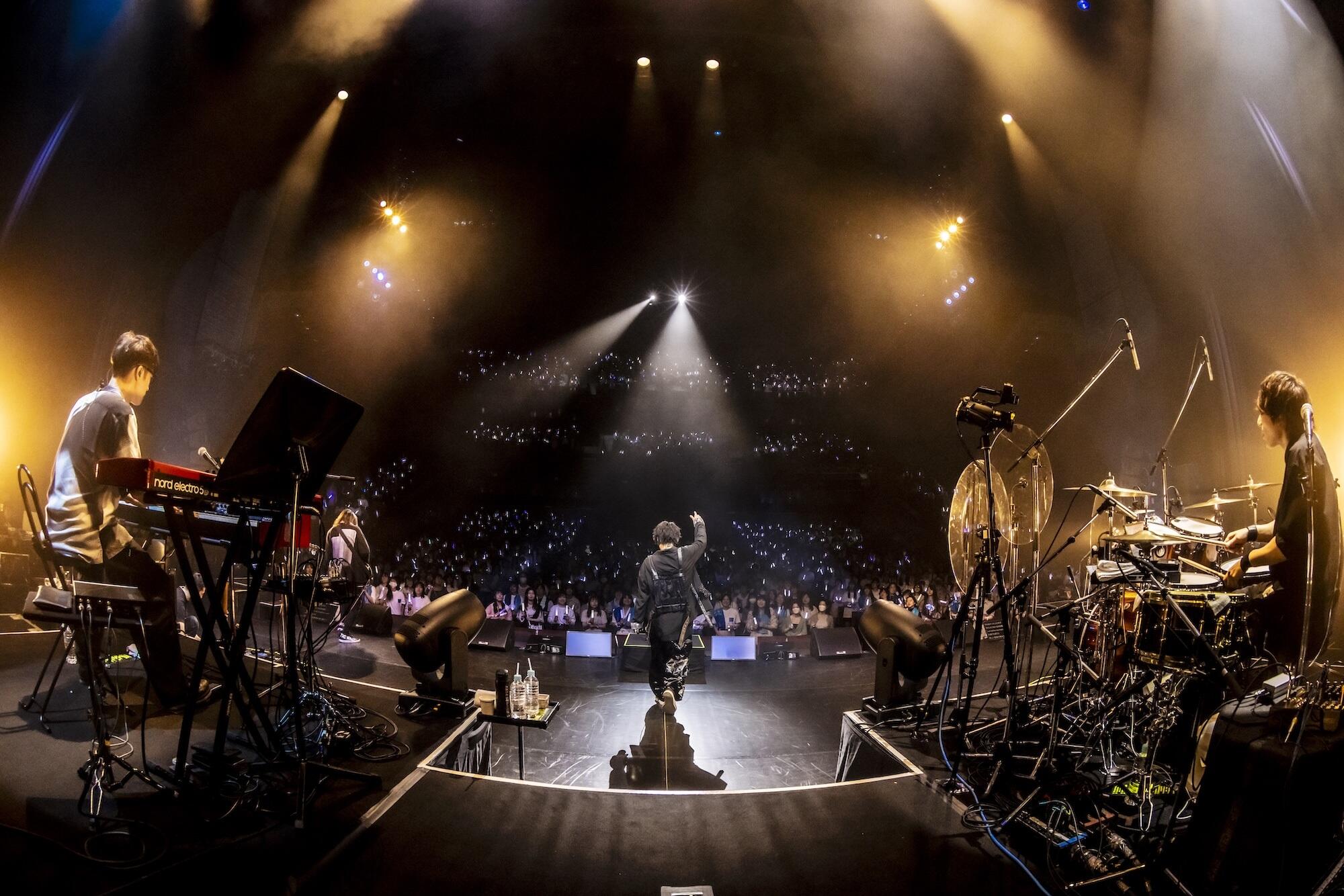 ソロアーティストデビューから1年半、待望の1stライブ当日は早くから、ライブTシャツやタオルなどをファッショナブルに着こなしたファンが多数集結。18時開演予定ということで千葉の大型フェスから駆け付けた猛者もいてホール周辺は大賑わい。関係各所とファンからのフラワースタンドが多数置かれたホール内は物販やフォトスポットに長蛇の列が形成され、グッズは完売が続出。入場すると、正面には大型スクリーンが下がり、二層式で構成されたステージ上段にはドラムセットとキーボードが置かれ、中央には階段が据えられている。