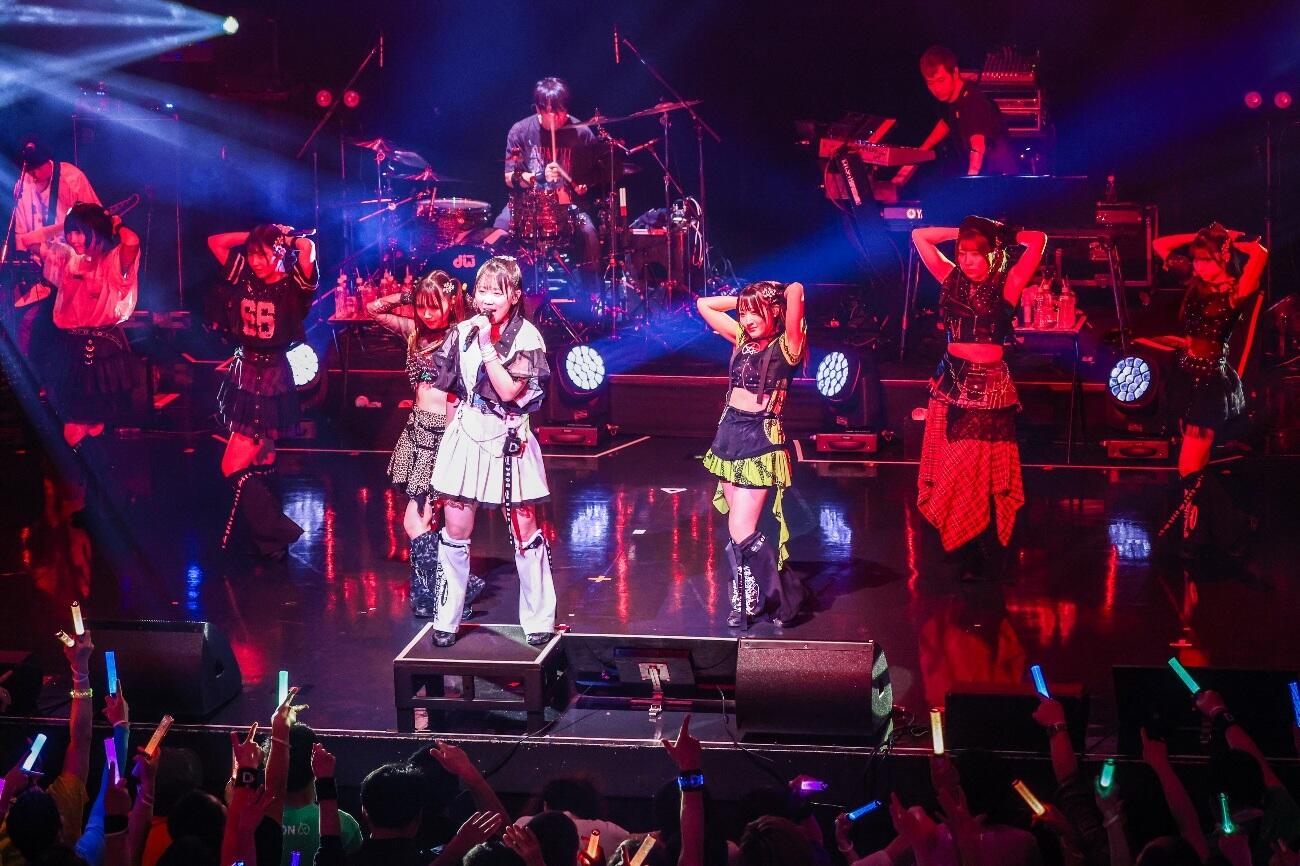 と『D+ has come』へ雪崩れ込む。作詞を大胡田なつき・田淵智也、作曲を林直大・田淵智也が担当した濃厚なダンサブルアッパーチューンに7人は入り乱れてステージを左右へ移動して飛びはね「ねえ捉えてよ 追いついてよ そんで…もっと知って!」「これこそ文明文化である 開花せよ未来」「これこそ一連一体である 謳歌せよ世界」「心が動いちゃもう止まれない 楽しみが過ぎる!」と熱唱、コールを扇動して締めくくる。