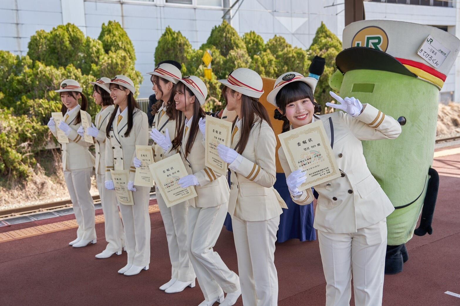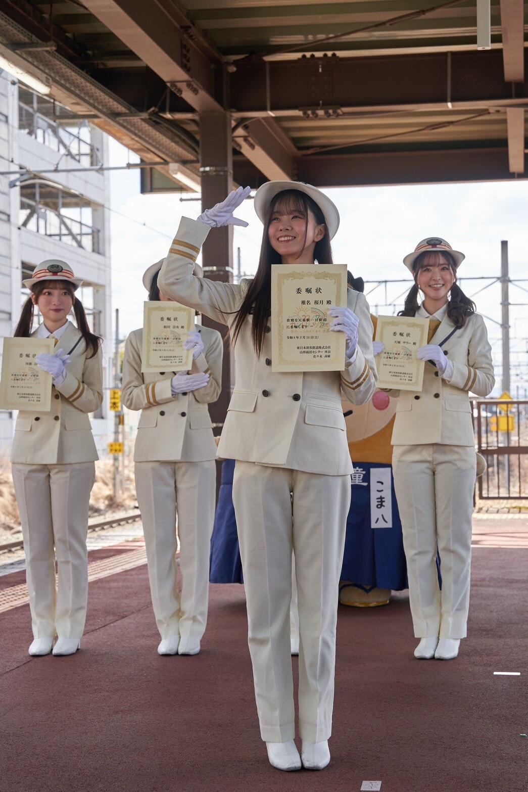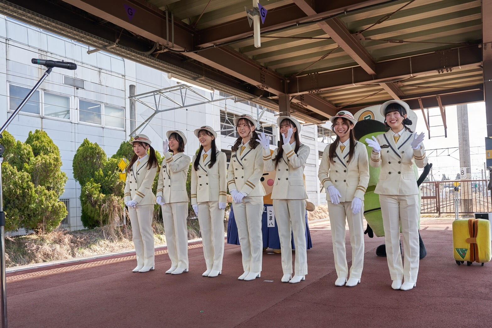 当日は、東京駅から天童駅まで、山形新幹線つばさ号の3車両を貸し切り、ファン参加型のツアーを実施。天童駅のホームには約200名のファンが集まり、相川奈央、麻丘真央、天城サリー、河瀬詩、椎名桜月、月城咲舞、望月りのの7名がホームで出迎えると、そのままJR天童駅一日駅長就任式が執り行われた。JR東日本 山形統括センター所長・佐々木高敏氏より委嘱状が授与され、メンバーはJR東日本の制服姿で一日駅長としての役割を担った。