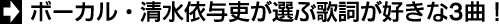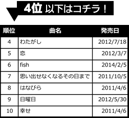 彼らの楽曲の中で幸せな恋愛を綴った曲の代表は、「花束」と「日曜日」だが、2曲とも曲自体は短い。それは“ノロケ話は長くするものじゃない”との意図があり、加えて幸せな場面は長く続かないという捉え方もできる。幸せな時間の過ぎる早さは、誰もが納得するはずである。逆に片想いや未練を描いた描写は、繊細に綴られており、愛しい人を思っている1人の時間は時に永遠のように感じるもの。曲の長さにもしっかりと意識しているところも、彼らが酸いも甘いも経験しているからこその産物なのである。 |