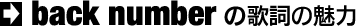 back numberというバンド名は、ボーカルの清水依与吏がバンドマンに彼女を取られ、元カノから見た自分は必要なくなった“バックナンバー”だ、というところからきている。そして、元カノを奪い返したいとの思いでバンドを結成し、音楽活動に励むことになった。そのため、インディーズ時代の楽曲は、元カノへの断ち切れない思いを綴った歌が多く、リリースしたアルバムタイトルも「逃した魚」「あとのまつり」と未練がたっぷりと詰まっている。そんな彼らに付いたネーミングは、“センチメンタル・ロック・バンド”。この“センチメンタル”との部分こそが、彼らを一言で表現するのにピッタリな言葉であり、彼らの人気の秘密を探る上でポイントとなる点なのである。 歩道橋の上にも横断歩道の向こうにも 駐車場の緑のフェンスの前にも たとえばあなたといた日々を記憶のすべてを消し去る事ができたとして |
